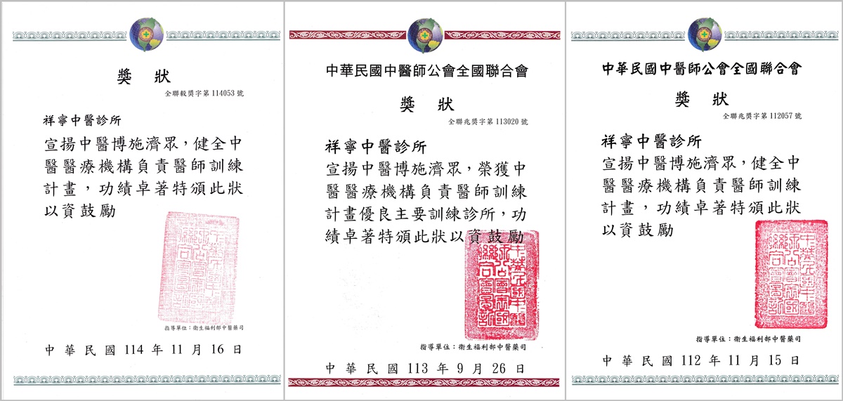 祥寧中醫診所(團隊)視病猶親,醫學相長,經衛福部評鑑認可為『訓練中醫師之教學院所』,身負宣揚與傳承中醫學之使命,健全中醫負責醫師主要訓練計畫;繼而連年榮獲佳績!