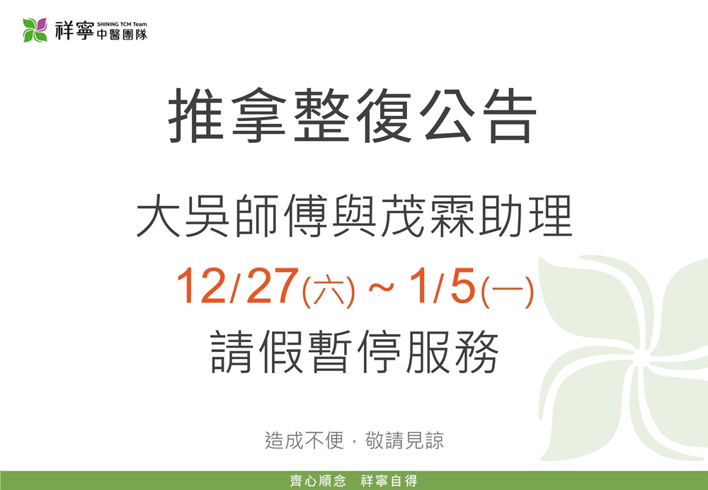 營業時間_ 12/27~1/5 大吳師傅與茂霖助理請假