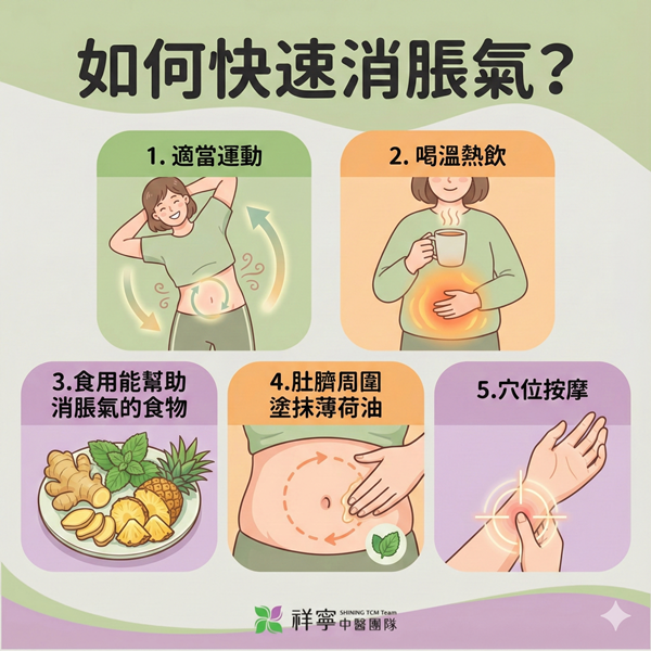 脹氣雖然常見,但背後反映的是腸胃蠕動、消化功能、飲食習慣或壓力調節的失衡。透過辨識脹氣位置,再搭配適當運動、調整飲食、按摩穴位等方式,大多數功能性脹氣都能獲得改善。若您有長期脹氣的困擾,歡迎諮詢祥寧中醫團隊,根據個人體質深入調理,讓腸胃恢復穩定與舒適,遠離反覆脹氣的不適。