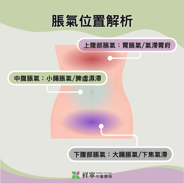 判斷脹氣的位置,有助於釐清氣體滯留的器官與主要成因:上腹部脹氣:胃脹氣/氣滯胃府