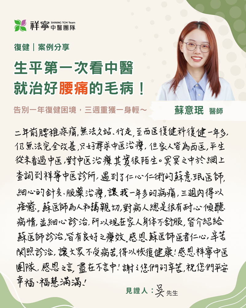 在蘇意珉醫師悉心針藥調理下